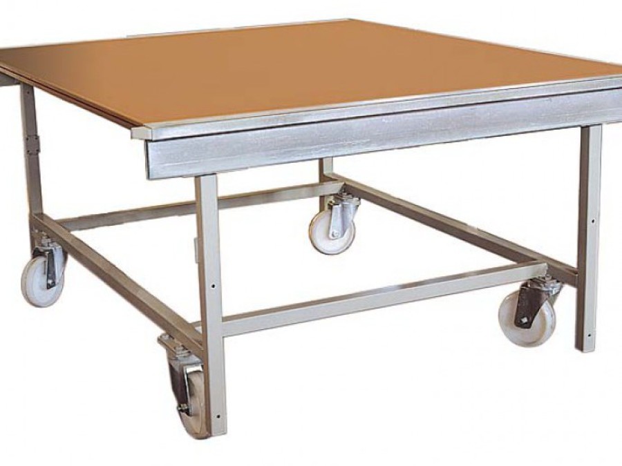 Costruìda sobre la misma estructura robusta de la mesa de extendido, posee iguales caraterìsticas. El plano de trabajo està constituìdo por una banda de PVC de color azul ò verde con textura de tela que se apoya sobre un plano de MDF de un espesor de 3 cm. A pedido se pueden obtener bandas con caracterìsticas técnicas adecuadas al uso de la cortadora vertical.