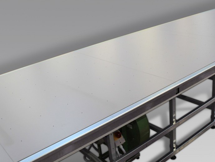 Ideal para mesas largas y materiales pesados. Costruido sobre la misma estructura robusta de la mesa de tendido, posee las mismas caracterìsticas. La superficie delplano de trabajo es en fibra nobilitada bordeada en ABS con foros paso 13x13 cm. La estructura del plano a "càmara de aire interna" asegura uniformidad de la difusiòn del aire evitando malgastes. La parte inferior del plano presenta un ùnico foro con un diàmetro de 10 cm en el cual se inserta el tubo de la canalizaciòn que conecta los paneles entre ellos y entre èstos y el motor soplante. Prestaciones ideales se obtienen aplicando un motor soplante cada 6-9 metros de mesa (teniendo en cuenta el ancho de la mesa y el peso del material tendido por metro cuadrado).